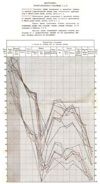 Для того, чтобы иллюстрировать эту сводную таблицу и сделать наглядным полную однородность отношений между высшими и низшими группами крестьянства в самых различных местностях, мы составили нижеследующую диаграмму, на которую нанесены процентные данные таблицы. Направо от столбца, определяющего процентные доли всего числа дворов, идет линия, показывающая положительные признаки хозяйственной состоятельности (расширение землевладения, увеличение количества скота и т. д.), а слева идет линия, показывающая отрицательные признаки хозяйственной силы (сдача земли, продажа рабочей силы; эти столбцы оттенены особой штриховкой). Расстояние от верхней горизонтальной линии диаграммы до каждой сплошной кривой линии показывает долю зажиточных групп в общей сумме крестьянского хозяйства, а расстояние от нижней горизонтальной линии диаграммы до каждой пунктирной кривой линии показывает долю несостоятельных групп крестьянства в общей сумме крестьянского хозяйства. Наконец, чтобы яснее изобразить общий характер сводных данных, мы провели «среднюю» линию (определенную вычислением арифметических средних из тех процентных данных, которые занесены на диаграмму. «Средняя» линия для отличия от остальных окрашена в красный цвет). Эта «средняя» линия показывает нам, так сказать, типичное разложение современного русского крестьянства.