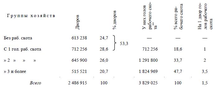 Два следующие столбца показывают распределение в крестьянстве рабочего скота и всего скота. Процентные доли скота очень незначительно отличаются от процентных долей посева: это и не могло быть иначе, так как количество рабочего скота (а также и всего скота) определяет размер посева и в свою очередь определяется им.