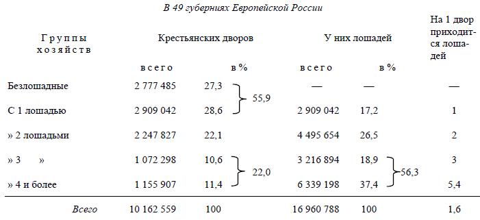Эти данные охватывают немногим менее четвертой части всего числа крестьянских дворов в Европейской России («Свод статистических материалов, касающихся экономического положения сельского населения Европейской России» – издание канцелярии комитета министров. СПБ. 1894 – считает в 50 губ. Европейской России 11 223 962 двора в волостях, в том числе крестьянских 10 589 967 дворов). По всей России мы имеем данные о распределении лошадей между крестьянами в «Статистике Российской империи. XX. Военно-конская перепись 1888 г.» (СПБ. 1891) и тоже: «Стат. Росс. ими. XXXI. Военно-конская перепись 1891 г.» (СПБ. 1894). Первое издание содержит обработку данных, собранных в 1888 г. о 41 губ. (в том числе 10 губ. Царства Польского), а второе – о 18 губ. Европ. России плюс Кавказ, Калмыцкая степь и Область Войска Донского.
