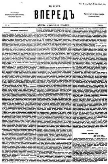 Первая страница большевистской газеты «Вперед» № 1, 4 января 1905 г. (22 декабря 1904 г.) с передовой статьей В. И. Ленина«Самодержавие и пролетариат» (Уменьшено)