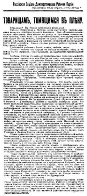Товарищи! Всюду, где у вас есть к тому возможность, обсуждайте великие события, происходящие на нашей родине. Заявите громко, что вы, вместе со всей лучшей частью русских солдат, не хотите царя, что вы требуете свободной республики, безвозмездной передачи помещичьих земель крестьянам, 8-часового рабочего дня, немедленного созыва Учредительного собрания. Заявите, что вы стоите на стороне Петроградского Совета рабочих и солдатских депутатов, что, вернувшись в Россию, вы встанете не за царя, а против царя, не за помещиков и богачей, а против них.