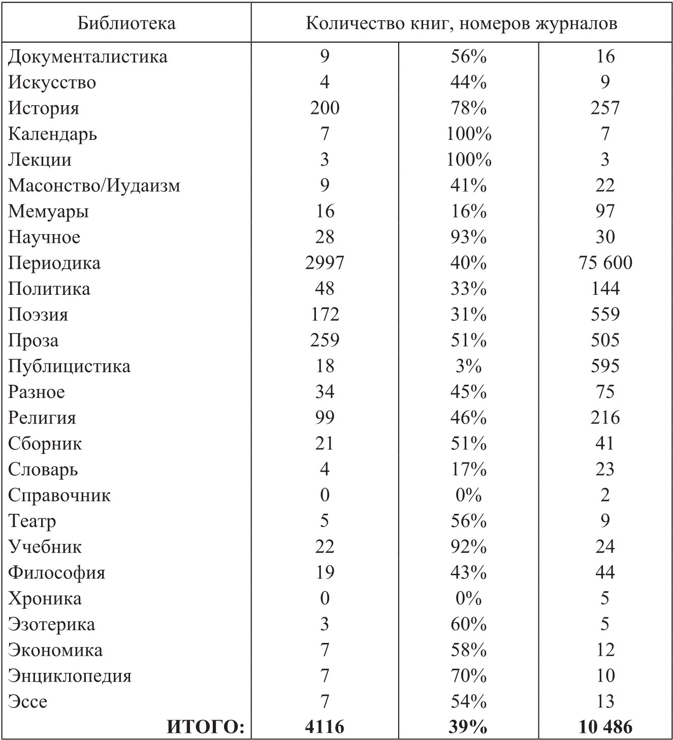 Ниже приводятся таблицы, дающие обзорную характеристику коллекции Крыловых-Плюсниных, включая обозначение объемов архивных фондов, описание собрания книг и журнально-газетной периодики и исторических артефактов.