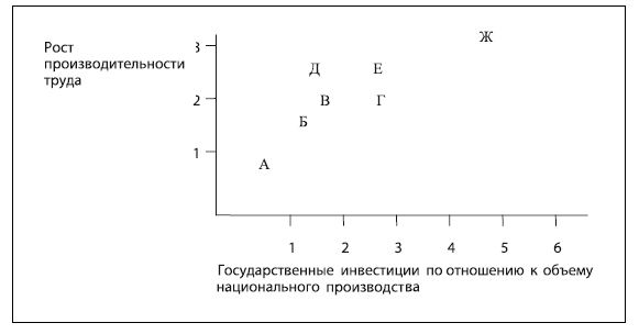 Наконец, для подтверждения своей мысли автор привлекает международные сравнения. На рис. 6 отражена взаимосвязь между динамикой производительности труда и долей инвестиций в инфраструктуру в ВНП семи промышленно развитых стран. Картина вполне однозначна. Такие страны, как Япония, направляющая значительную часть ВНП на развитие инфраструктуры, отличаются высокими темпами роста производительности труда. В тех же странах, где, как в США, в инфраструктуру вкладывается сравнительно мало средств, производительность труда растет относительно медленно.