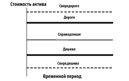 Этап 1. Построение базового графика актива (рис. 1) особых сложностей не вызывает. Горизонтальная шкала – период (время). Вертикальная шкала – условная стоимость актива. В качестве единицы измерения используются понятия: дорого; дешево; сверхдешево и т. д. Важный момент заключается в том, что базовый график подходит практически для оценки любого актива.