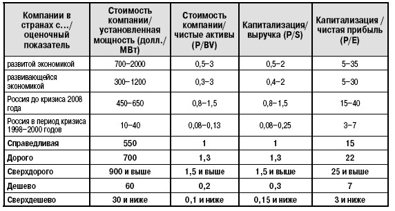 Начнем с внутренней информации «РАО ЭС Востока». Страна – Россия. Рассматривать особенности государства не будем, так как это элементарный вопрос. Отрасль – энергетика. Нас интересует критерии оценки компаний энергетического сектора. Здесь также ничего нет сложного. Для оценки (сравнения) используют следующие показатели: установленные мощности; протяженность сетей; планы будущей деятельности по вводу новых мощностей и т. д. Можно добавить производственные показатели (выработка электроэнергии, тепла). Что касается финансовых результатов деятельности, то берут во внимание следующие показатели (руб.): стоимость чистых активов; объем продаж; величина чистой прибыли и некоторые другие. Так же нам для расчета пригодится информация о количестве выпущенных акций. Что имеем? Количество акций – 43 117 млн шт. (Количество привилегированных акций составляет 5 %, соответственно, в расчете капитализации, а также всех оценочных показателей будем использовать общую сумму акций.) Величина чистых активов. Возьмем данные за девять месяцев 2008 года (далее была произведена переоценка) – 53 млрд руб. Установленные мощности не менее 4,7 ГВт (взяли удельные веса по Д30). Так как для упрощения задачи будут взяты два показателя – установленная мощность и стоимость чистых активов, – расчет общей выручки и чистой прибыли не приводится. Данные показатели читатель может рассчитать самостоятельно.