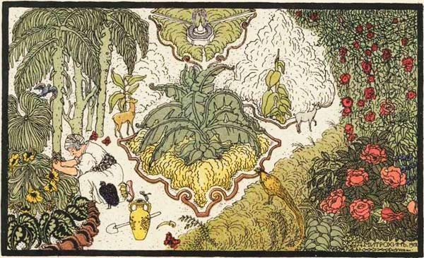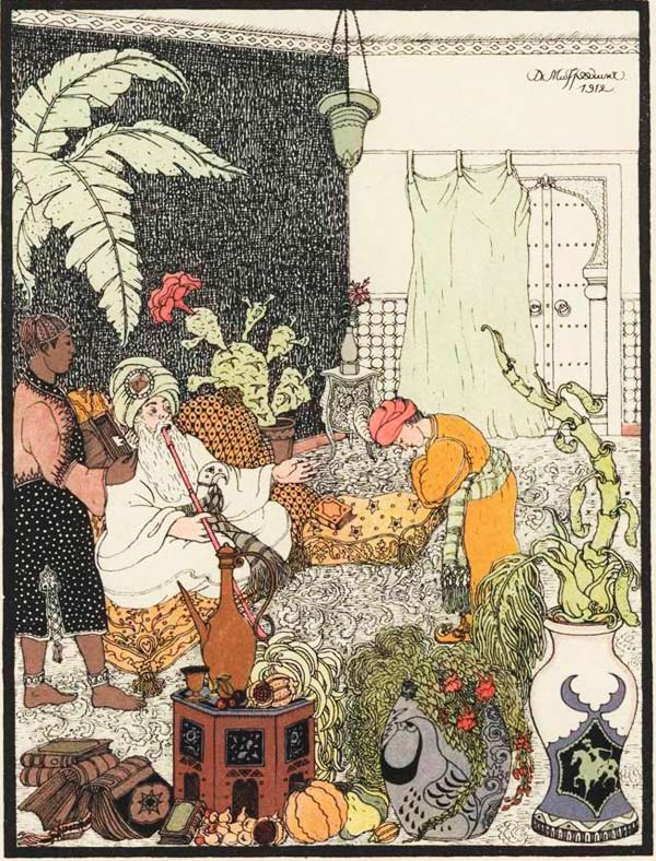Комната эта была вся уставлена цветами, пальмами, бамбуками, кедрами; поле был покрыт персидскими коврами; по стенам лежали подушки, на которые садился профессор. Здесь сам профессор был другим человеком: он надевал на голову турецкую шаль, как чалму, подвязывал длинную седую бороду, надевал шелковый халате, широкие шаровары, желтые туфли и, несмотря на то, что был самый миролюбивый человеке, подвязывал саблю и затыкал за пояс кинжал, украшенный поддельными драгоценными камнями, курил двухаршинную трубку, и лакеи, одетые в восточные платья, прислуживали ему; у некоторых были даже вычернены лица и руки.
