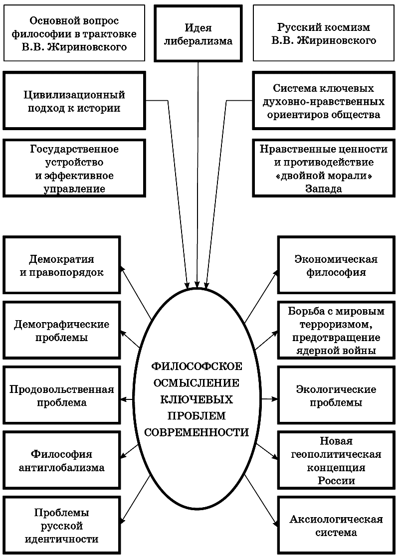 В этом свете давайте рассмотрим творческий путь Владимира Вольфовича Жириновского – не просто как учёного и политика, лидера и создателя первой в России нового времени партии парламентского типа, за которую вот уже четверть века голосуют граждане России в ходе выборов депутатов Государственной Думы Федерального Собрания Российской Федерации, но и как самобытного философа. Для наглядности представим структуру его философского наследия в виде следующей схемы (рис. 1).
