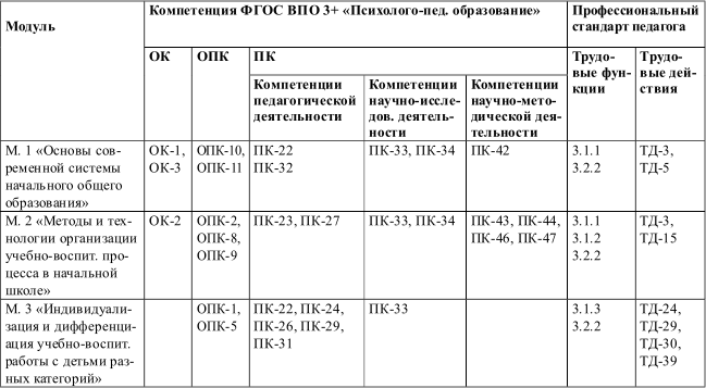 Матрица компетенций – следствие заявленного принципа модуляризации практико-ориентированной программы. Матрица компетенций представляет модули программы и соответствующие их темам образовательные результаты, уточненный перечень компетенций. Матрица компетенций программы «Инновационная начальная школа» приведена в таблице 3[1]. При необходимости можно уточнить темы модулей так, чтобы каждому модулю соответствовал сравнительно небольшой перечень компетенций и трудовых действий.