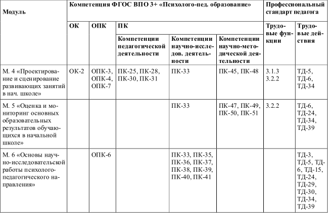 Сопоставление полученных списков образовательных результатов двух стандартов (ФГОС ВПО и Профессионального стандарта педагога) – необходимый элемент проектирования программы, не только из-за различия в описании (формулировок) образовательных результатов профессиональным и образовательным стандартом, но также и для того, чтобы уточнить объем и характер практического опыта, который может приобрести студент в период обучения в магистратуре. Результатом такого сопоставительного анализа являются: (а) формулирование дополнительных к ФГОС ВПО компетенций, (б) выделение из списка обобщенных компетенций ФГОС ВПО совокупности субкомпетенций, соответствующих по смыслу трудовым действиям профессионального стандарта и т. п.