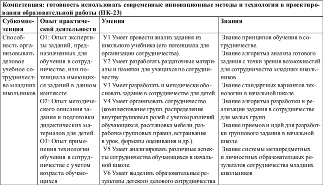 Образовательные результаты ОПОП, выраженные в трудовых действиях (см. главу 1), и профиль магистерской программы позволяют отобрать виды профессиональной деятельности, к которым готовится выпускник и которые перечислены в ФГОС ВПО. Для магистерской программы «Инновационная начальная школа» в качестве актуальных видов профессиональной деятельности выпускника были выбраны педагогическая, научно-методическая и научно-исследовательская деятельность, конкретизированные в названном документе профессиональными компетенциями. Помимо этого, ФГОС ВПО содержит перечень общепрофессиональных и общекультурных (универсальных) компетенций, которыми должен овладеть выпускник данного направления магистратуры независимо от профиля программы.