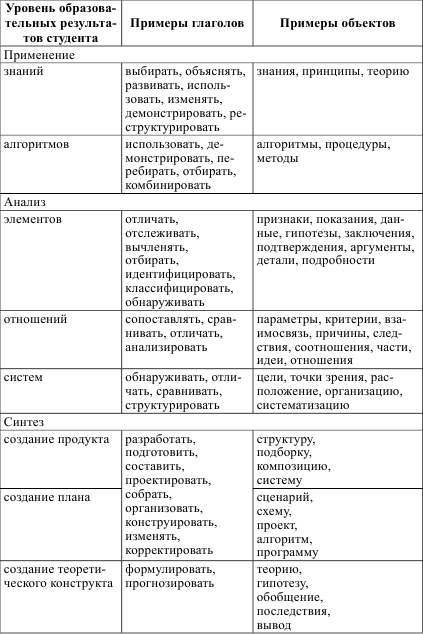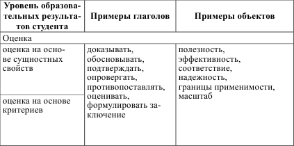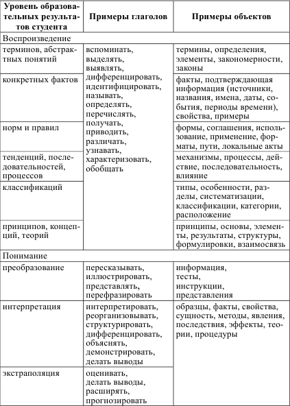Традиционную трудность для разработчиков рабочих программ дисциплин в логике деятельностного подхода составляет конкретизация образа знаниевого образовательного результата. При планировании знаниевых образовательных результатов рекомендуется опираться на матрицу таблицы 5. Матрица адресована в первую очередь преподавателю, разрабатывающему рабочую программу. Матрица позволяет планировать результаты обучения как единство предметного знания и мыслительной операции, соответствующей уровню его освоения. Матрица построена на принципах таксономии Бенджамина Блума, включающей шесть уровней достижения образовательных результатов: воспроизведение, понимание, применение, анализ, синтез, оценка.