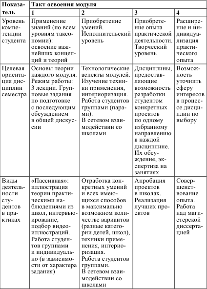 Такое структурирование событий модулей задает, в свою очередь, особенности взаимодействия вуза со школами, участвующими в реализации магистерской программы. От возможности присутствия студента на уроках (1-й такт) и отработки умений с помощью учителя-супервизора (2-й такт) до стажировочной практики. В случае, если образовательная программа реализуется в модели последовательной или смешанной реализации модулей, выделение тактов также целесообразно, так как определяется уровень освоения компетенций студентами, что, в свою очередь, задает характер деятельности обучающихся в дисциплинах и практиках и диктует требования к оценочному инструментарию текущего и промежуточного оценивания (см. главу 5).