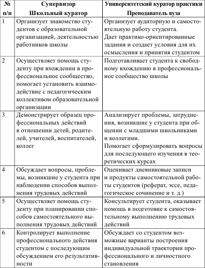 предполагают изменение позиций преподавателей университетов и школьных кураторов практики, которые должны принять новые роли активных посредников от вуза к школе и от школы к вузу (можно сказать, что супервизор – это резидент университета в школе, а профессор – преподаватель-организатор);