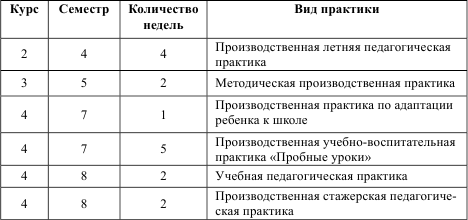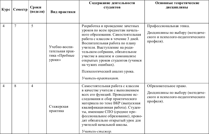 За весь период обучения в университете педагогической практике отводится на факультете начального образования 16 недель – при 4-летнем бакалавриате и 18 недель – при 5-летнем сроке обучения, что составляет в среднем около 80\90 дней, или примерно 10–15 % от общего времени подготовки учителя начального образования с высшим образованием. В течение указанного срока студенты:
