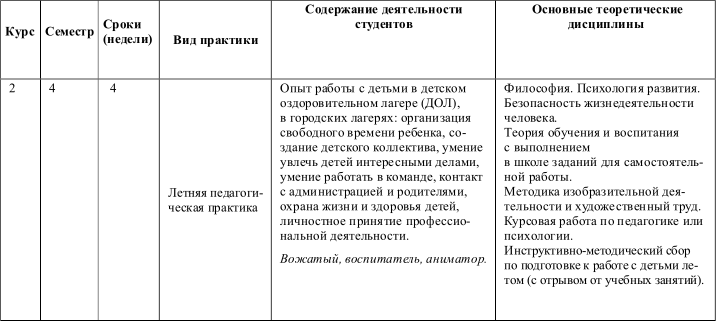 Каждый вид практики решает конкретные задачи и предполагает поэтапное включение студентов в разнообразные виды деятельности. Так, в период летней практики студенты участвуют в организации свободного времени ребенка в детских парках, различных центрах отдыха, городских и загородных лагерях отдыха. На этом, первом, этапе профессионального становления они приобретают опыт общения с детьми, опыт работы по созданию детского коллектива, умения работать в команде, несут ответственность за принятые решения, отвечают за охрану жизни и здоровья детей. Этот первоначальный опыт способствует осознанному принятию каждым своей личностной профессиональной позиции. На этом уровне педагогическая деятельность осуществляется ими в качестве воспитателей, вожатого, волонтера, аниматора.