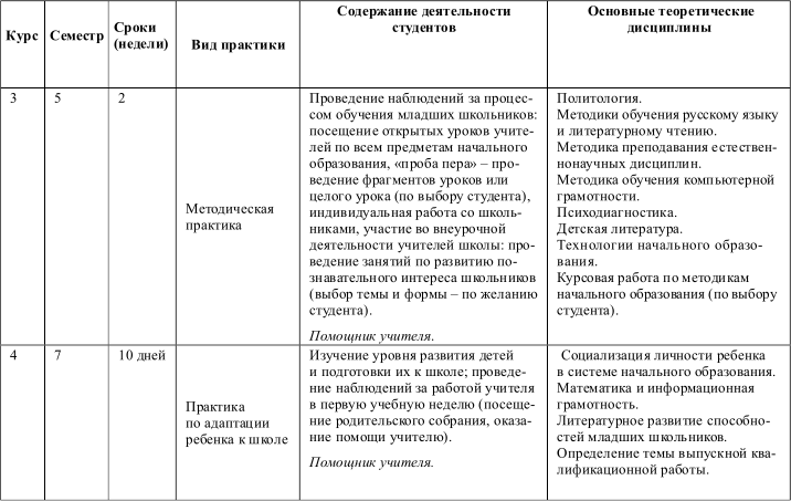 Таким образом, педагогическая практика предполагает регулярное пребывание студентов в образовательных учреждениях. Это обеспечивает им возможность вести постоянные наблюдения за организацией учебно-воспитательного процесса в школе и формировать различные профессиональные умения – общаться с детьми, организовывать коллективные и индивидуальные занятия, участвовать во внеклассной и внеурочной деятельности детей младшего школьного возраста [95].
