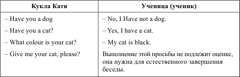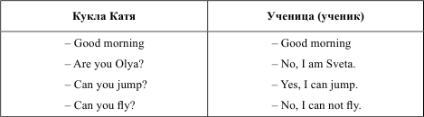 Средство наглядности: различные игрушечные звери на столе учителя. Учитель говорит: «Я директор цирка. Расскажи о своем звере так, чтобы я мог принять его в цирк. Кукла Катя тоже внимательно тебя слушать. Но сначала она расскажет о своем любимом звере». Кукла Катя: I have a frog. My frog is green. My frog can jump. My frog can’t fl y.