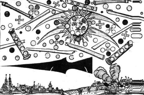 В этой книге к рис. 30 дается следующий комментарий: «В “Листке” [в газете “Нюрнбергский листок”] сообщается о “страшном видении”, имевшем место на рассвете 14 апреля 1561 г. Очевидцами были “многочисленные мужчины и женщины”, видевшие “шары” кроваво-красного, синеватого или черного цвета, а также круглые диски, в большом количестве скопившиеся близ Солнца; они объединялись в группы “примерно по три в длину, а иногда и по четыре в форме квадрата; впрочем многие были сами по себе. Между шарами можно было увидеть кресты кроваво-красного цвета”. Кроме того, “были видны две” (на рисунке три) “большие трубы, внутри которых находились шары в количестве трех, четырех и даже сверх того. Эти тела принялись воевать друг с другом” [как в рассказе гарнизонного сапожника], что продолжалось примерно час. Потом “все это, как бы пылая, начало падать на землю с Солнца, с неба; и все сгорело в большом облаке пара”» [5. С. 155].