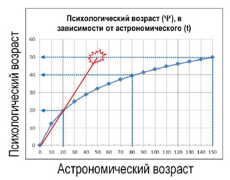 3) Если человек и после 20 лет сохранит ощущение времени жизни таким, каким оно у него было в детстве (прямая линия), то в возрасте 50 календарных лет его психологический возраст будет тоже 50 лет. Другими словами его психологический возраст будет такой же, как у обыкновенного человека прожившего 150 календарных лет (событие обозначено «звездой» на рис. 42).