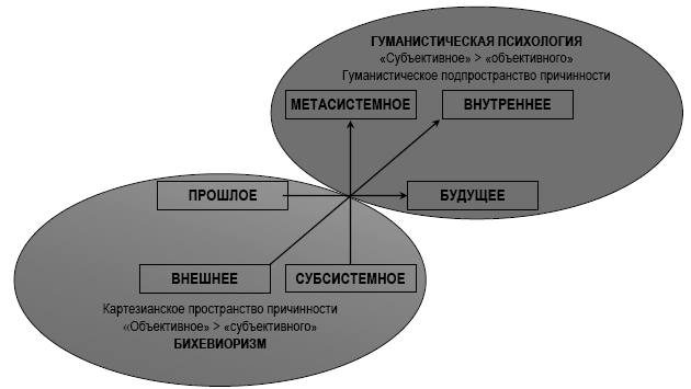 Образно говоря, это поэтапное движение от картезианской психологии «сознания», которое именуется в психологии «бихевиоризмом», к гуманистической психологии происходило как движение в пространстве причинности (рис. 43) по трем осям: от «внешнего» к «внутреннему» (Фрейд), от «прошлого» в «будущее» (Адлер) и от «субсистемного» в «метасистемное» (Юнг). В процессе этого движения мы все ближе приближались к подпространству причинности гуманистической психологии.