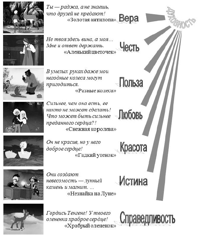 На доске пишутся имена семи Святостей и даются к ним пояснительные образы из известных мультипликационных фильмов (рис. 50). Можно распечатать рисунок в форме плаката на А5 и раздать каждому.