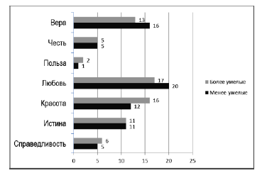 Согласно общему профилю ценностных ориентаций, построенному по этим рисункам, будущие учителя начальных классов большее предпочтение отдали социальному типу личности по имени Любовь (26 %), потом идут Вера (21 %)) и Красота (20 %), далее предпочтения идут в следующем порядке: Истина (16 %), Справедливость (8 %), Честь (7 %) и Польза (2 %).
