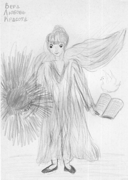 Самоанализ: «На рисунке я старалась выразить духовное состояние человека. По моему мнению, изображенные на рисунке: сияние, голубь и книга являются символами человека Веры».