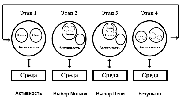 Таким образом, поведение, устремленное к определенной цели, поддерживается иерархией Систем. Следует отметить, что эта системная иерархия Активность-Мотив-Цель (рис. 27) после ее формирования очень устойчива. Устойчивость Мотива выражается в том, что когда организм охвачен поиском пищи, то встреча с объектом удовлетворения сексуальной потребности Лисом не вызовет у Лисицы сексуального желания. А устойчивость Цели выражается в том, что когда Лисица охвачена поиском Мыши, то она может с Зайцем столкнуться нос к носу – аппетит на зайчатину у нее может и возникнет, но с трудом.