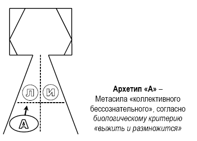 На схеме «сцена-подвал» Архетип как эволюционно старая (т. е. животный инстинкт) Метасила изображена слева от пунктирной линии (рис. 28). Ее составным элементом является элемент «личного бессознательного», в данном случае Либидо – «Л». Напомню, что слева мы изображаем животные Силы, в прошлом явно участвовавшие в борьбе за выживание.