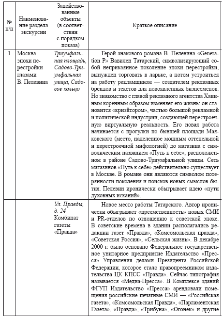– сформировать у слушателей понятие о «московском городском тексте» и его трансформации в культуре постмодернизма (на примере популярных произведений В. Пелевина); проиллюстрировать такие ключевые элементы постмодернистской эстетики, как феномен игры, диалог с популярными мифологемами эпохи;