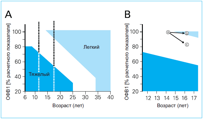 Рис. 2. Топографическое картирование фенотипов заболевания легких при муковисцидозе (CF). Панель А: карта фенотипа агрессивности заболевания по материалам статьи Konstan et al.[117]. Пациенты, имеющие тяжелый фенотип заболевания легких (черная зона), обладают более высоким риском смертности в молодом возрасте, тогда как пациенты, имеющие легкий фенотип заболевания (серая зона), обладают большей вероятностью доживания до старшего возраста. Популяция подростков с CF находится между вертикальными пунктирными линиями. Панель В: агрессивность заболевания среди подростков с CF в возрасте 12–17 лет. Фенотип агрессивности в 14-летнем возрасте при ОФВ1, равном 100 % расчетного показателя (круг «a»), является неопределенным и зависит от скорости снижения ОФВ1 за последующие 2 года (круг «b» по сравнению с «c»). По материалам статьи Journal of Cystic Fibrosis, Volume 8S, Konstan MW, Wagener JS, VanDevanter DR, Characterizing aggressiveness and predicting future progression of CF lung disease, pages 8S:S15-S19, copyright 2009 with permission from Elsevier.