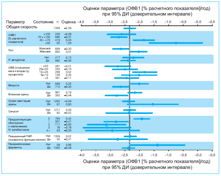 Рис. 3. Многовариантное моделирование скоростей снижения ОФВ1 у подростков с муковисцидозом (CF) в возрасте 13–17 лет[118]. Параметры представлены в левой колонке, n = число пациентов, включенных в модель с данным значением параметра. Полосы представляют собой 95 % доверительные интервалы (ДИ). Пунктирная вертикальная линия представляет собой общую оценку скорости снижения ОФВ1 для популяции (2,34 % расчетного показателя/год). ПФП = показатели функции печени; ОВВ = отношение веса к возрасту. По материалам статей: Journal of Pediatrics, Volume 151 Number 2, Konstan MW, Morgan WJ, Butler SM, Pasta DJ, Craib ML, Silva SJ, Stokes DC, Wohl MB, Wagener JS, Regelmann WE, Johnson CA, Risk factors for rate of decline in forced expiratory volume in one second in children and adolescents with cystic fibrosis, pages 134–139, copyright 2007 with permission from Elsevier.