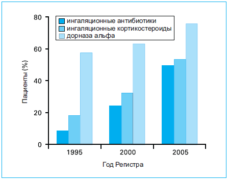 Постепенное улучшение состояния здоровья легких у подростков с CF за период с 1995 по 2010 г. и соответствует уменьшению признаков и симптомов респираторных заболеваний у подростков[110]. Возможно, не случайно с 1995 по 2010 г. также наблюдалась тенденция роста применения постоянных пульмонологических терапий в пределах популяции подростков ESCF, причем назначение ингаляционных антибиотиков возросло с 8,0 % до 50,0 %, ингаляционных кортикостероидов – с 18,1 % до 53,5 % и дорназы альфа – с 57,5 % до 76,0 % (рис. 6)[111]. Такая тенденция примечательна, поскольку она формировалась в популяции с улучшенной функцией легких[112] против тенденции к более редкому назначению этих терапий у пациентов с более высоким % расчетного значения ОФВ1, чем у пациентов с более низкими значениями ОФВ1[113][114]. Наблюдаемое улучшение состояния здоровья легких во взрослой популяции с CF США, вероятно, также связано с заметными улучшениями нутритивного статуса, роста и телосложения младших детей с CF по сравнению с достигнутыми в последние десятилетия[115].