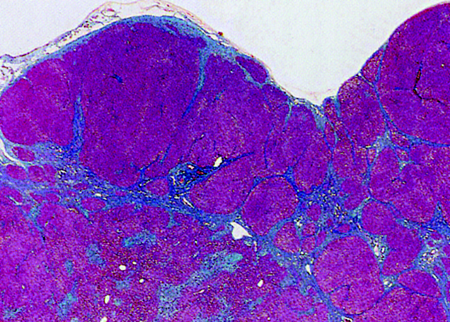 Эксплантат печени 13-летнего мальчика с муковисцидозом. (Рис. 7А) Общий вид в малом масштабе, показывающий макронодулярную капсулу печени. В глубоких отделах печени видны стадии изменения фиброза от перипортального фиброза до полного цирроза. (Рис. 7В) Изображение в увеличенном масштабе (исходное увеличение х100) показывает фокальный билиарный цирроз с фиброзными перегородками, связывающими портальные области, и окружающие регенеративные узелки гепатоцитов. Расширенные портальные области демонстрируют пролиферацию желчных протоков, вторичную по отношению к закупорке желчных протоков. (Рис. 7С) Изображение в увеличенном масштабе (исходное увеличение х100), показывает более раннюю стадию фиброза, еще не цирротическую. Имеется фиброзное портальное расширение с перипортальными фиброзными перегородками и периодические портальные тракты без регенеративных узелков. Окрашивание трихром по Массону: красный = гепатоциты, зеленый = коллаген. Любезно предоставлены Dr Amanda Charlton, Children's Hospital at Westmead (Сидней, Австралия).