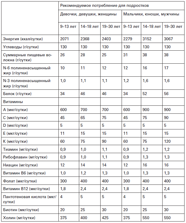 Таблица 7.2. Рекомендации норм потребления (строки, выделенные жирным шрифтом) и Адекватного уровня потребления для подростков [5–8]