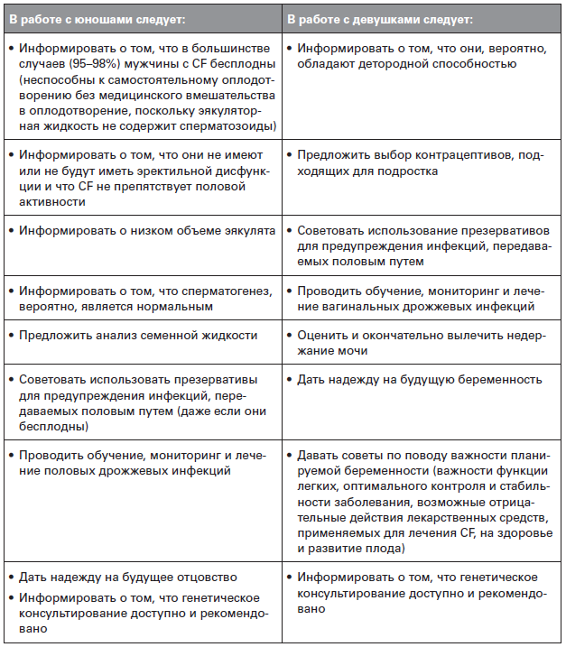 Необходимые вопросы для обсуждения: опыт подростка с хроническим состоянием (задержка пубертатного периода, заниженная оценка собственного я, склонность к рискованному поведению), специфичная для пола репродуктивная физиопатология при CF, поведенческие аспекты сексуальности при CF, контрацепция при CF, надежда на будущее материнство или отцовство, возможности проведения вспомогательной репродуктивной технологии и генетическая значимость CF (таблица 8.2)[474].