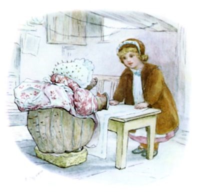 "Then Mrs. Tiggy-winkle made tea—a cup for herself and a cup for Lucie. They sat before the fire on a bench and looked sideways at one another. Mrs. Tiggy-winkle's hand, holding the tea-cup, was very very brown, and very very wrinkly with the soap-suds; and all through her gown and her cap, there were hair-pins sticking wrong end out; so that Lucie didn't like to sit too near her.