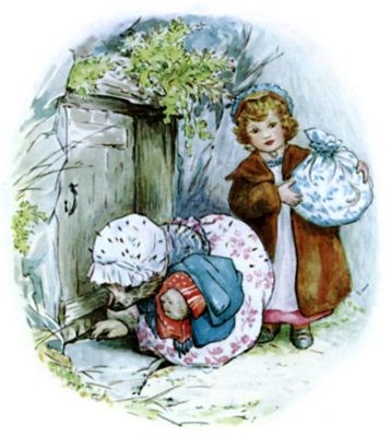 Then away down the hill trotted Lucie and Mrs. Tiggy-winkle with the bundles of clothes!