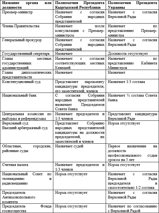 Можно полагать, что столь существенные различия в полномочиях в кадровых вопросах объясняются несколько разным в Кыргызстане и Украине пониманием механизма сдерживающих противовесов, гарантий против узурпации власти одной из ее ветвей.