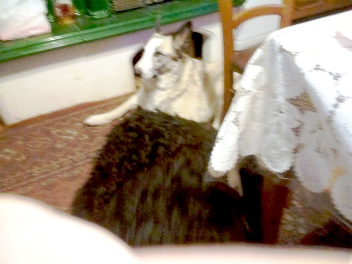 Гостями были наши члены семьи – верные собачки из большого дома – Манечка и Ева. Маню можно рассмотреть, а Еву – с трудом. Она уже обросла к зиме своей копной шерсти, поэтому она и на снимке похожа на чёрную копёшку. Глаз не видно, значит она свернулась калачиком.