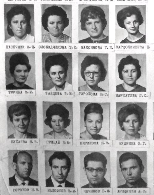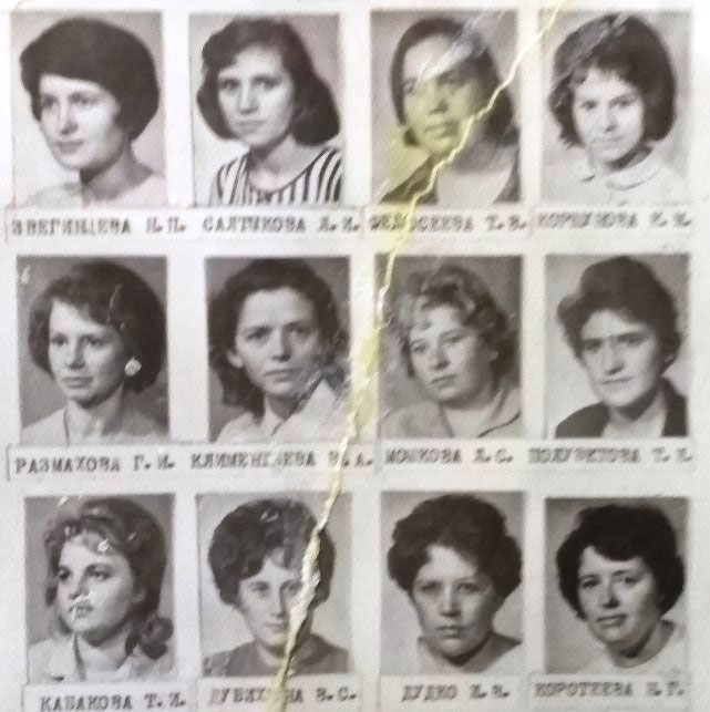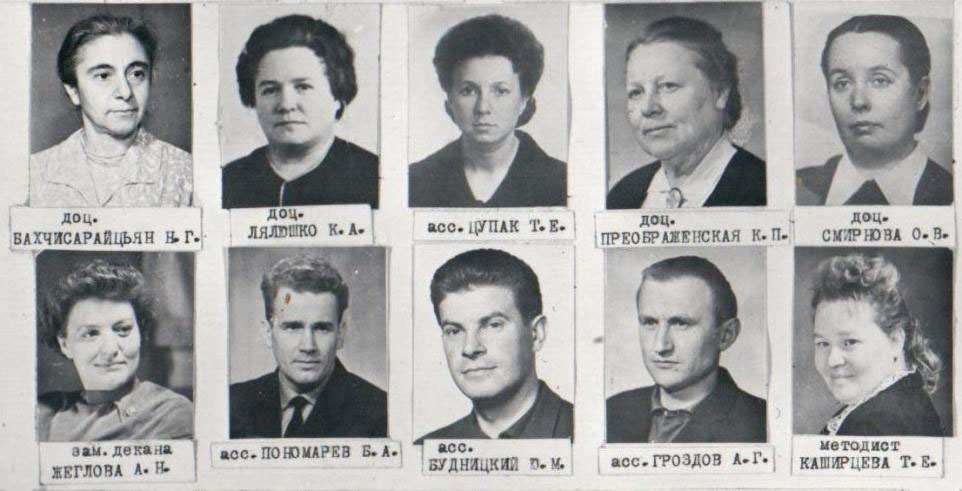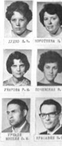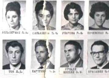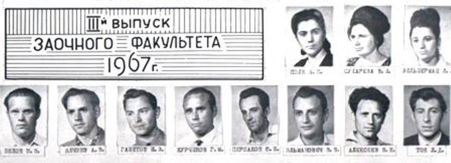 Крайняя справа в нижнем ряду – наш Ангел-хранитель, методист факультета. Ей мы сдавали контрольные работы. Она вела учёт наших задолженностей. Когда нужно было пойти в Авебуху С. Б. с какими ни будь просьбами, она всегда выступала в качестве адвоката, защищая нас от его «строгостей». Хотя строгим он был только с виду, и ворчал – лишь «нам же на пользу». Он любил нас всех, как своих детей, и мы платили ему в ответ тем же…