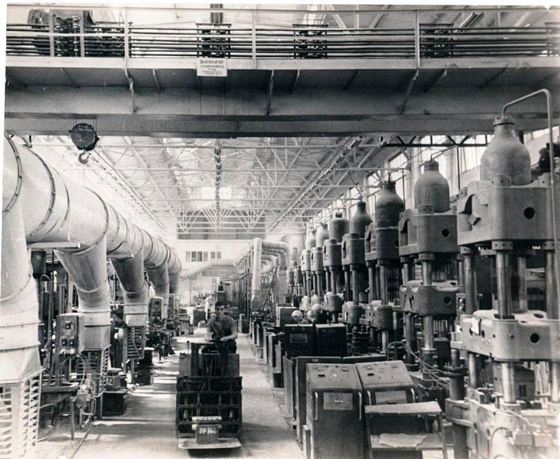 Основной цех – прессовочный. Пресс – это разъёмная станина. На нижней части – "на столе", устанавливалась пресс форма. Сверху – тяжелая махина – сам пресс. В пресс-форму засыпалась нормированная доза порошка с красителем или таблетки. Пресс опускался. Нажималась кнопка. Температура поднималась до заданной. Через несколько минут пресс поднимался, и из пресс формы вытряхивалось уже готовое, но очень горячее изделие. На тех, кто обслуживал пресса, были одеты большие фартуки, а на руках – рукавицы, чтобы не обжечься. Если процесс прессования одного изделия длился несколько минут, то работницы могли обслуживать два и даже три пресса одновременно.