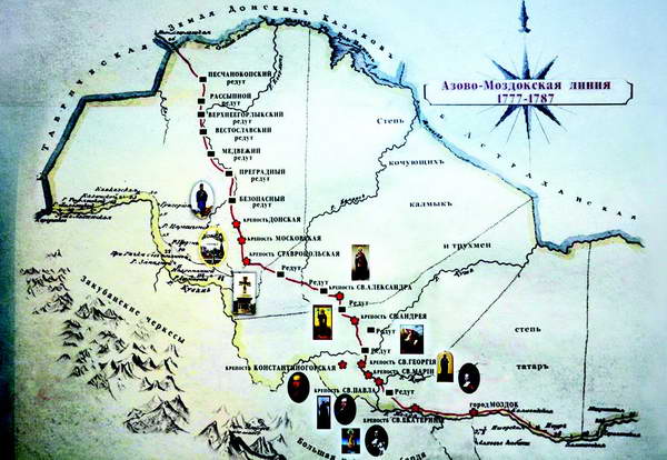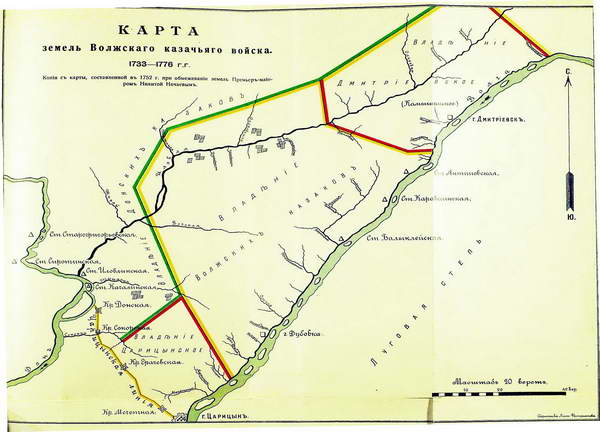 24 апреля 1777 года Екатериной был утверждён доклад Потёмкина «Об учреждении линии от Моздока до Азова», что положило фактическое начало основанию новой, Азово-Моздокской оборонительной линии. На ней предполагалось построить ряд укреплённых поселений: «1-е Святыя Екатерины, 2-е Святого Апостола Павла, 3-е Святыя Марии, 4-е Святого Георгия, 5-е Апостола Андрея, 6-е Святого Александра Невского, 7-е Ставрополь, 8-е Донское, 9-е Московское, 10-е Владимирское»[322]. Первые пять из упомянутых станиц-укреплений должны были основать казаки с Волги, для чего и была выслана сюда практически вся остальная часть Волгского войска, расселённая на протяжении около 200 вёрст. Сохранив своё прежнее наименование, бывшие волго-донцы на новом месте составили в строю казачий полк из пяти сотен. В его штат были включены: командир полка, пять станичных атаманов и в каждой станице по одному есаулу, сотнику и хорунжему, 514 казаков[323]. Летом 1780 года с Волги были переселены последние казачьи семьи, хотя немногочисленные остатки тамошних бывших донцов всё же сохранятся и потом будут причислены к астраханским казакам.