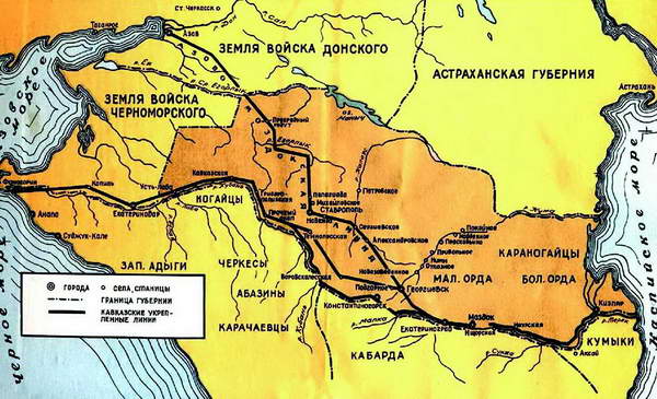 28 февраля 1792 года из части бывших волжско-донских казаков, проживавших на Кубани, был сформирован Кубанский полк поселённых на Кавказской линии казаков (впоследствии этот полк был включён в состав Кубанского казачьего войска). 26 февраля 1799 года оставшаяся часть казаков бывшего Волгского казачьего Войска была записана в Волгский полк[335]. Казачьи полки на Кавказских укреплённых линиях, кроме Черноморского казачьего войска, жили совершенно самостоятельной жизнью, управлялись каждый сам по себе, имели собственные земельные наделы и подчинялись в военном отношении начальнику Кавказской линии. Всё мужское население станицы считалось служилым, а служба начиналась с 15 лет. Молодёжь до 20 лет и мужчины свыше 50-ти несли её в пределах станицы и крепости. Вместе с непосредственным участием в боевых походах казаки несли прежде всего охранную пограничную службу, которая делилась на «станичную» (охрану внутреннего порядка, защиту населения от «разных случайностей» приграничной жизни) и «кордонную» (охрану всей Кавказской области от набегов со стороны соседних с ней горских племён). Всю границу необходимо было держать под постоянным наблюдением, для чего между станицами были устроены посты и кордоны, а для обозрения местности в станицах и на постах устраивались вышки, которые позволяли казакам увидеть угрозу на расстоянии 5 и более километров.