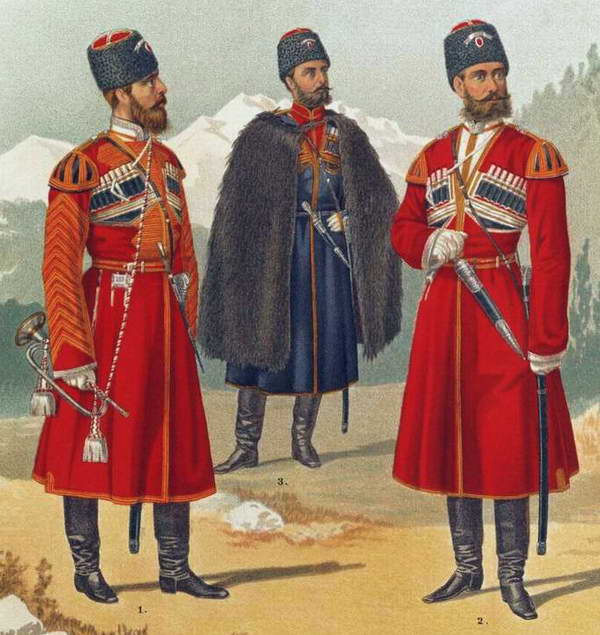 Постепенно граница России на Кавказе отодвигалась, военная повседневность казачьего быта отступала от селений, расширялись посевы, казаки вступали в мирные отношения с покорившимися горскими народами. Это приносило много пользы обеим сторонам. Казаки внимательно относились к своим недавним противникам и перенимали у них многое: взятые когда-то с Волги тяжёлые сабли и пики, длинные и неуклюжие, проигрывали горскому вооружению и быстро были забыты. Кинжал и шашка, страшное, но лёгкое по весу оружие, стали казачьим обиходом, но не обойтись было и без винтовки с пистолетом. Казацкие жупаны – и те отошли в область предания, заменяясь мало-помалу черкесками, которые казаки предпочитали за лёгкость и удобство покроя. В XIX веке казаки уже одеты в черкески с газырями на груди для патронов и в бешметы (кафтан длиной ниже бёдер) с боковыми грудными карманами, чувяки или мягкие сапоги. И даже традиционным головным убором казака стала папаха, которую шили из овчины, каракуля, мехом наружу. Незаменимой верхней одеждой казака в походе стала бурка[336]. В 1831 году Высочайшим повелением обмундирование и вооружение «черкесского образца» стали официальными для всех линейных казаков.