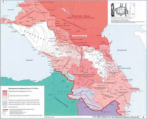 Одним из первых шагов российского правительства на Кавказе было проектирование и строительство укреплённых линий крепостей – опорных пунктов для дальнейшего продвижения и защиты самой российской территории от набегов неприятеля. В 1774-75 годах была начата постройка Азово-Моздокской линии от Терека до самого Дона. Десять её крепостей должны были зримо утвердить власть России в этом регионе и обезопасить её передовые гарнизоны, состоявшие в основном из казаков: гребенских, терских, а также спешно переселяемых донских, хоперских, волжских.