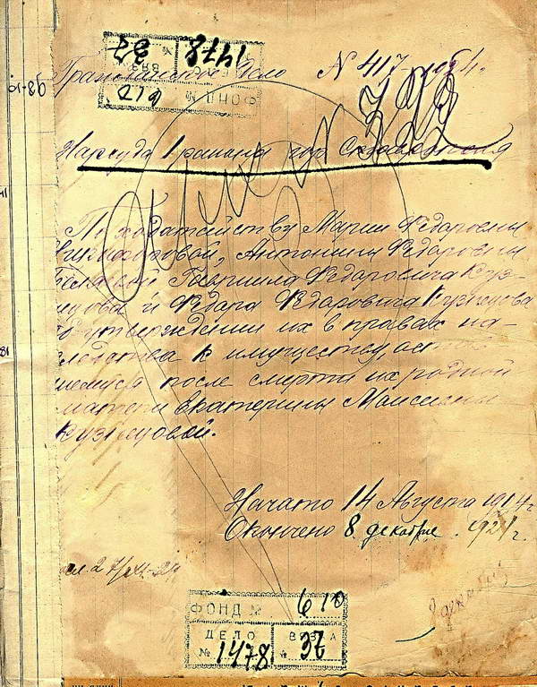 После смерти матери нашей гр-ки гор. Ставрополя Екатерины Моисеевны Кузнецовой, умершей 27 августа 1923 года, осталось посмертное имущество, находящееся в гор. Ставрополе по Верхнеподгоренской улице под № 83, заключающееся в усадебном месте с постройками. К означенному имуществу наследниками являются: 1) Антонина Федоровна Беляева, урожденная Кузнецова – дочь умершей; 2) Мария Федоровна Никифорова, урожденная Кузнецова – дочь умершей; 3) Гавриил Федорович Кузнецов – сын умершей и 4) Федор Федорович Кузнецов сын умершей, последние трое проживающие по Верхнеподгоренской ул. в доме № 83 гор. Ставрополя. Оставшееся имущество после смерти гр. Екатерины Моисеевны Кузнецовой – нашей матери оценивалось в 1914 году в 1000 рублей. К упомянутому имуществу просим нас утвердить в правах наследства в У\ доли каждого и выдать соответствующий документ на права владения вышеупомянутым имуществом.