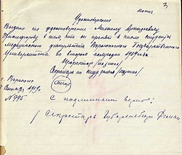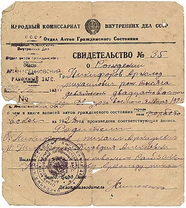 В метрической книге Ставропольского Кафедрального Собора церкви за тысяча восемьсот восемьдесят седьмой год (1887 г.) в 1-й части о родившихся мужского пола под № 60 значится следующая запись: родился двадцать третьего числа марта месяца Гавриил у нея. родители: титулярный советник Федор Семенов Кузнецов и жена его Екатерина Моисеева Акт подписал священник Хованский Выпись выдана по прошению гр. Никифоровой Гербовый сбор взыскан в сумме одного руб. – коп.
