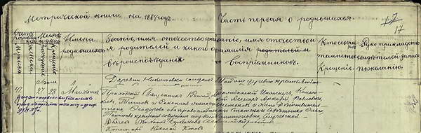 В метрической книге Ставропольского Кафедрального Собора церкви за тысяча восемьсот восемьдесят девятый год (1889 г.) в 1-й части о родившихся