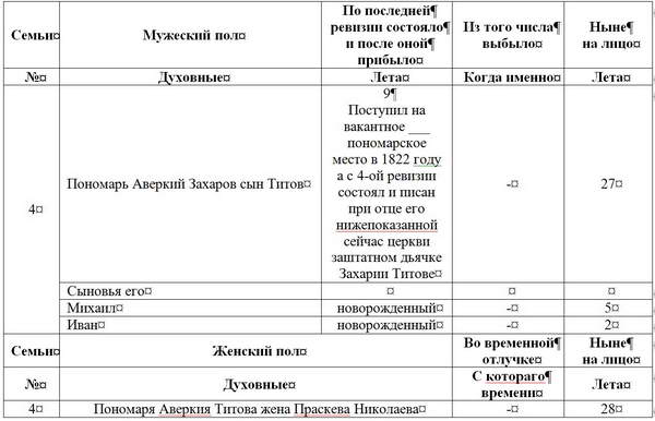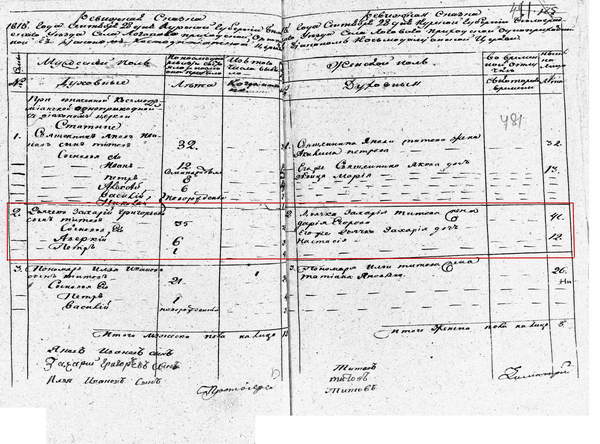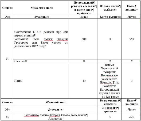 Дьячек Захарий Григорьев сын Титов, 35 сыновья его: Аверкий, 6, Петр, 1 дьячка Захария Титова жена Дария Егорова, 41 его же дьячка Захария дочь Настасия, 12